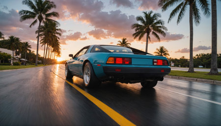 a classic muscle car speeds along a palm-lined coastal road with motion blur capturing its power and vintage charm in a scenic tropical setting perfect for automotive lovers and travel enthusiasts