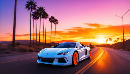 Colorful sports cars are parked under a stunning sunset, reflecting light off their polished surfaces. Palm trees silhouette against a vibrant sky, creating a picturesque evening atmosphere.