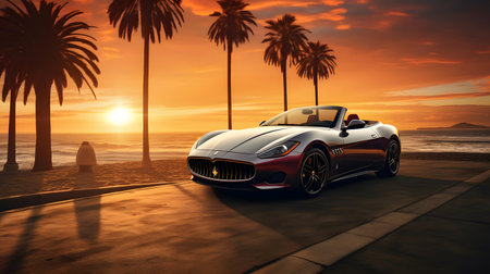 A purple sports car parked on a sandy beach as the sun sets, creating a vibrant and striking image, A vibrant purple sports car in the backdrop of a setting sun, AI Generated