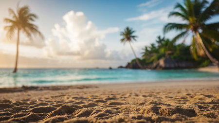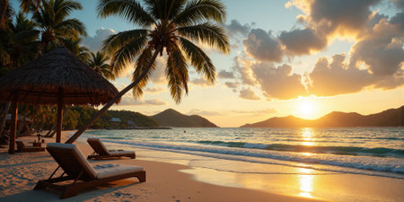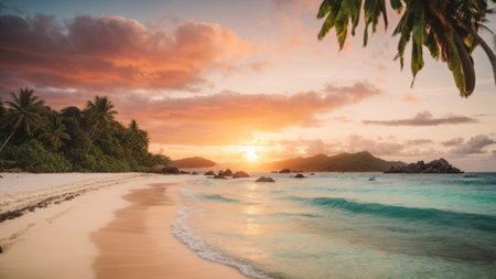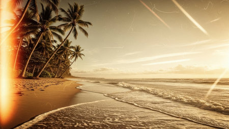 A serene tropical beach at sunset, with palm trees gently swaying in the breeze. The sun casts a warm golden glow over the sand and waves, creating a tranquil and picturesque scene.