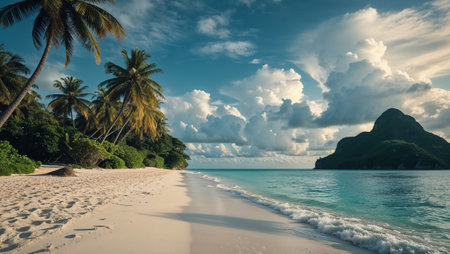 A breathtaking view of a tropical beach with pristine white sand, turquoise waters, and swaying palm trees. The image evokes a sense of tranquility and paradise, inviting viewers to escape to a serene tropical destination.
