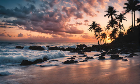 Beautiful sunset on the beach with palm trees and sea waves.