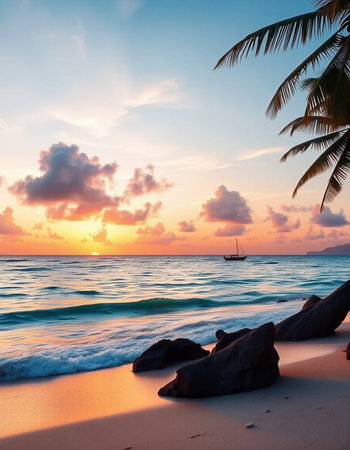A stunning sunrise over a tropical beach, with gentle waves and palm trees silhouetted against a colorful sky, evoking tranquility.