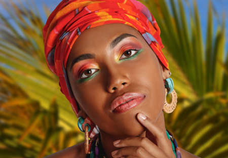 Close-up portrait of a young and pretty African American black woman on a background of palm leaves. Cosmetics, ethnicity.