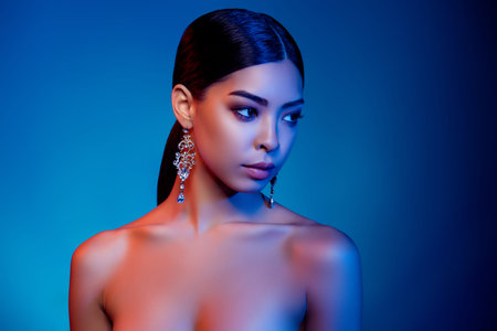Photo of feminine magnificent lady empty space futuristic festival isolated shine glowing gradient color background