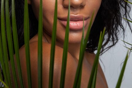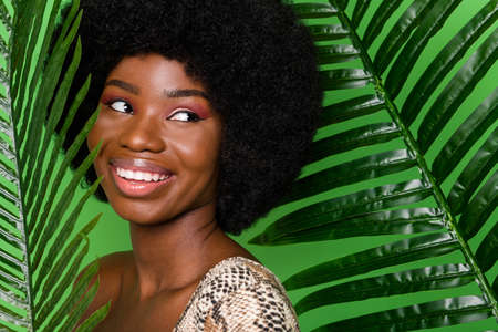 Cropped photo of Afro American young lady standing next to tropical leaf. Beauty and advertising concept