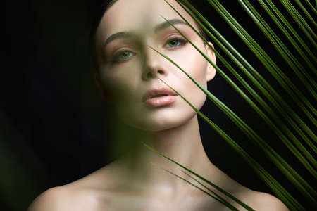 beautiful girl in palm leaves. Beautiful young woman with Make-up. Beauty Portrait. Natural cosmetics