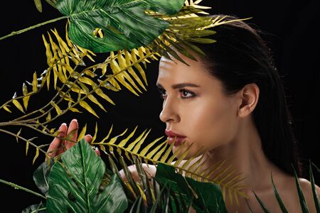 Portrait of concentrated woman touching leaves isolated on black