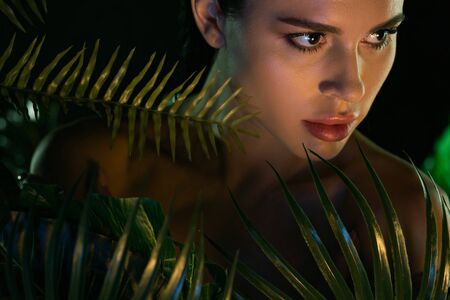 pretty african american woman looking at camera near exotic leaves on blurred foreground, banner