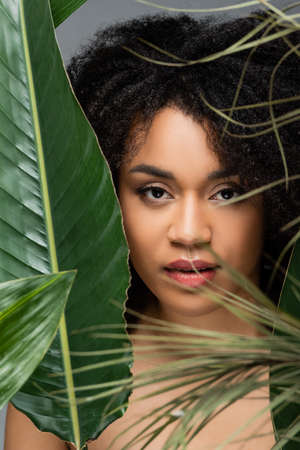 pretty african american woman with natural makeup looking at camera near green leaves isolated on grey