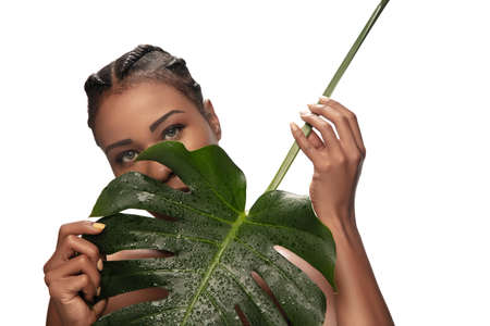 Fresh. Portrait of beautiful african-american woman isolated on white studio background with monstera leaf. Beauty, fashion, skincare, cosmetics concept. Copyspace for ad. Well-kept skin, fresh look.