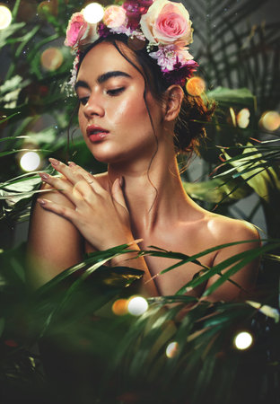 Nature, beauty and woman with skincare for wellness, cosmetic health or body healthcare grooming. Flower, plant and face of dermatology model relax with advertising for natural facial or skin product