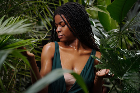 Woman with serene expression surrounded by lush, green tropical foliage, standing still amidst nature, feeling tranquility and deep contemplation