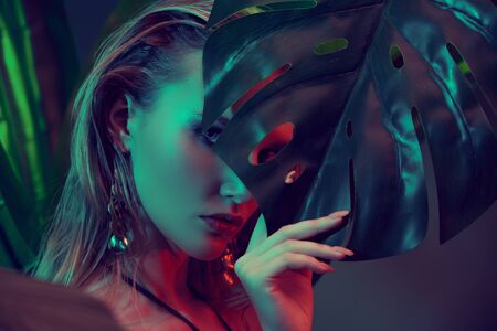 Portrait of sexy savage woman in leopard print bikini standing at, hiding behind leaves of tropical tree. Summer vibes