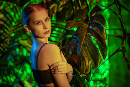 Photoshoot in the jungle. Lovely girl with brown hair and soft makeup stands among tropical greenery in warm sunset light. Spa, skincare and cosmetics. Vacation in tropical countries.