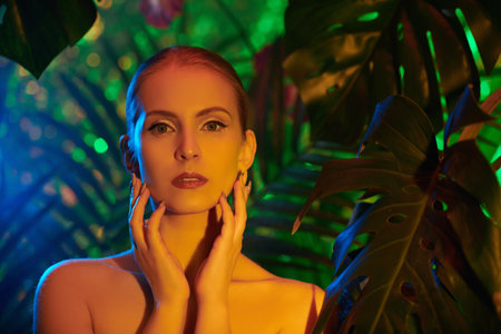 Romantic female on a background of palm leaves with hands near face.