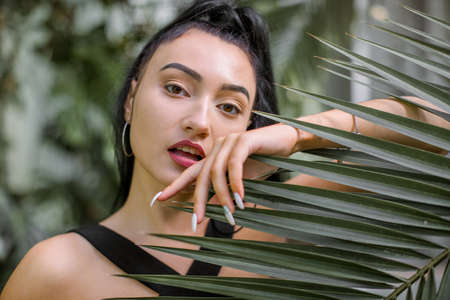 Summer fashion beauty portrait. Close up of face of beautiful Asian Japanese woman with long dark hair, wearing black dress, posing to camera with tropical palm trees and exotic plants on background.