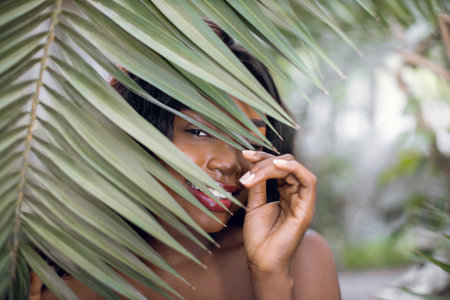 Photograph of a young African American woman posing against a tropical green leaf. Conceptual image for natural cosmetics.