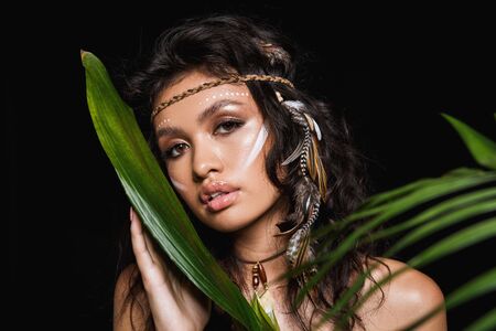 Beauty portrait of an attractive sensual young brunette woman wearing tribal accessories posing with tropical leaves isolated over black background