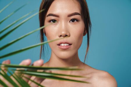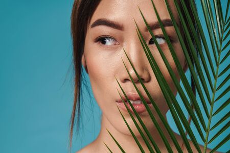 nude woman with palm leaf asian appearance clean skin cosmetology makeup