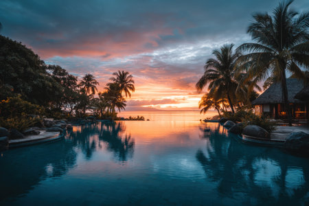 Tropical resort scene at dusk; calm pool reflects vibrant sky, palm trees silhouette