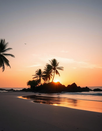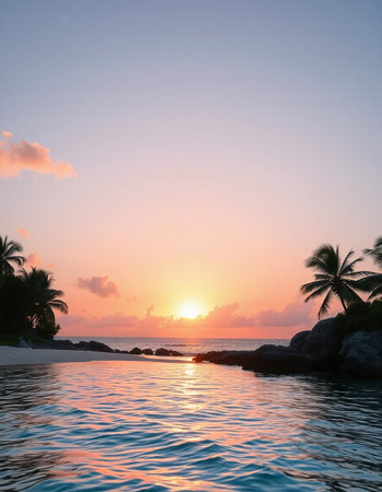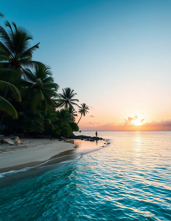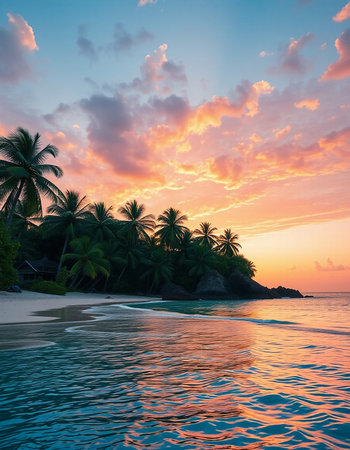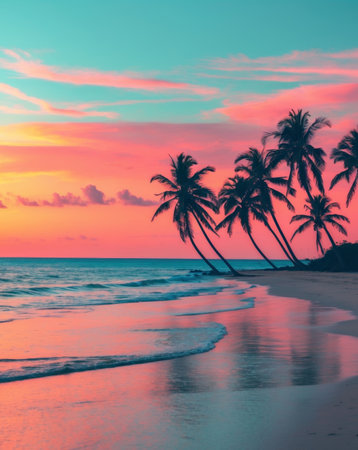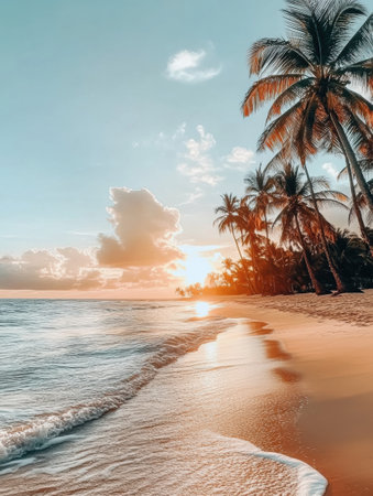 Experience the beauty of a tranquil tropical beach at sunset, featuring gentle waves lapping at the shore, framed by swaying palm trees and a vibrant sky.