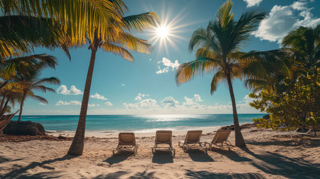 Experience the serenity of a picturesque beach with sun loungers surrounded by lush palm trees, bright sunlight, and clear blue waters, ideal for relaxation.