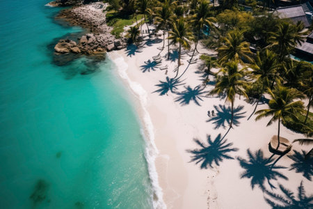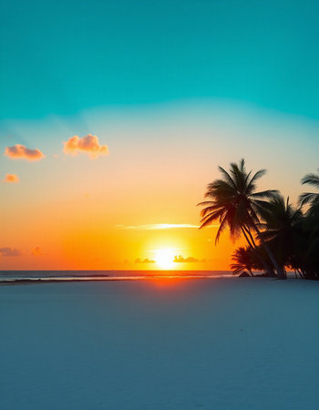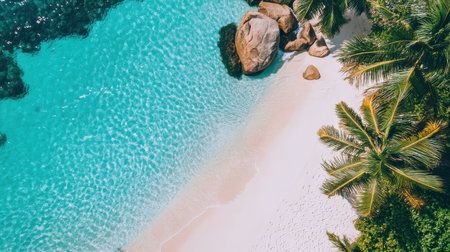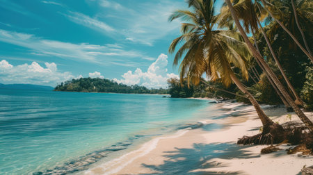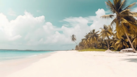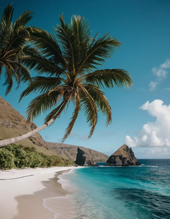 A beautiful tropical scene with palm trees, white sand, and turquoise water. The perfect backdrop for summer holidays and relaxation.