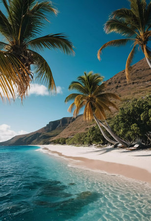 A breathtaking view of a tropical island beach featuring soft sand, vibrant palm trees, and sparkling turquoise waters, inviting relaxation amidst nature's beauty.