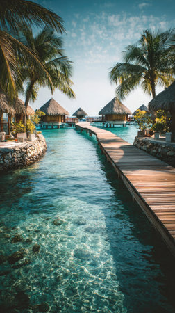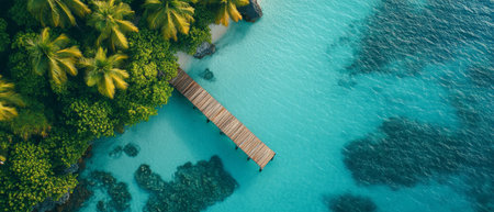 The scene features a peaceful wooden dock extending over clear turquoise waters, flanked by vibrant palm trees under a bright sky, perfect for relaxation and exploration.