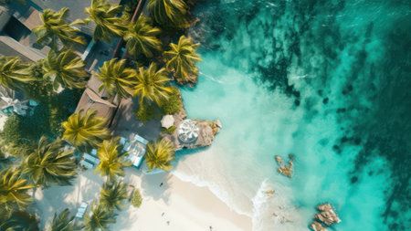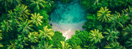 A breathtaking top-down aerial view of a secluded tropical paradise, showcasing a lush canopy of green palm trees encircling a serene white sandy beach and clear turquoise water.