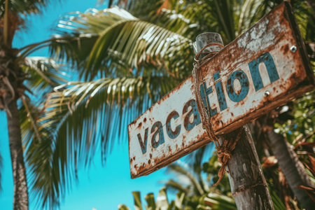 Vacation sign with palm trees on background, vintage toned