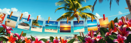 A string of photos hangs from a palm tree on a tropical beach, showcasing memories of sunny days