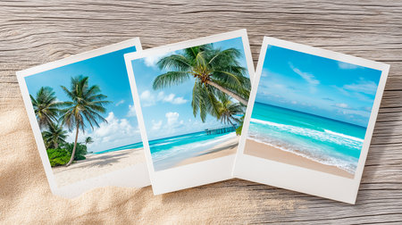 Photo frames with tropical beaches on wooden background with empty space for text. Banner for advertising travel and postcards.