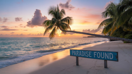 A serene beach at sunset with a leaning palm tree and a sign that reads Paradise Found.