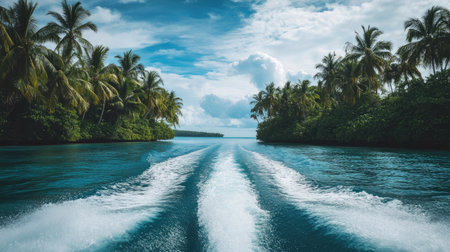 A dramatic view of a speedboat wake framed by lush tropical islands, with palm trees swaying in the background.