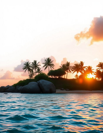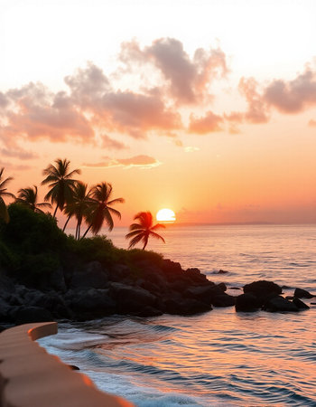 A coastal landscape features palm trees and ocean waves under a colorful sunset. The image displays warm tones from the setting sun, illuminating the water and sky. Suitable for travel or tourism promotions, this scenery could be used to evoke feelings of tranquility or depict natural beauty.