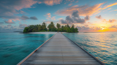 Wooden walkway leading to tropical island with palm trees and turquoise sea