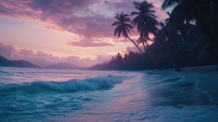 A serene beach scene at dusk showcasing gentle waves lapping at the sandy shore. Silhouetted palm trees frame the vibrant sunset and tranquil sky.