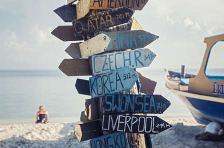 Time to travel. Traveling background. Signs with country distances and directions. Distance markers. Direction arrow. Travel concept.