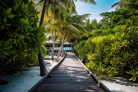 A beautiful wooden bridge crosses gentle waters, framed by lush palm trees and vibrant greenery, creating a serene and tranquil tropical escape.