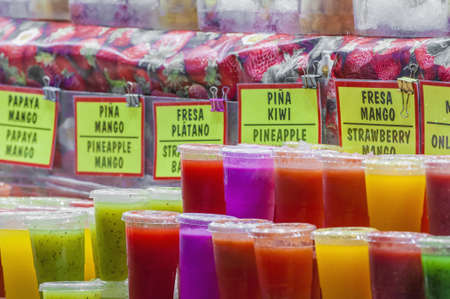 A variety of colorful, fruity drinks on ice at market in Valencia