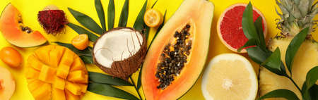 Backdrop or banner of exotic tropical fruits background. Colorful fresh exotic fruits on yellow desk. Pineapple, coconut, passion fruit, strawberry, carambola. Flat lay, top view, copy space
