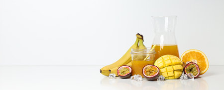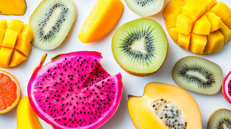 summer paradise concept. Top view of fresh dragon fruit, kiwi, papaya, pineapple, orange, lime, granodilla, carambola, blueberries and coconut on a white backdrop with copyspace