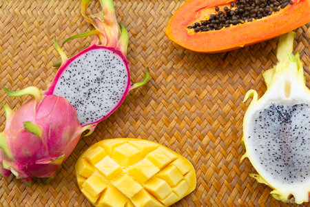 Delicious Exotic Tropic Fruits Top View on Wicker Mat Background