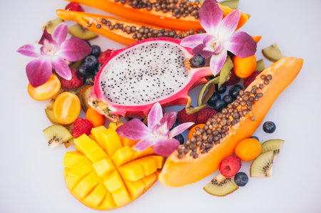 Fresh organic exotic fruits on white background. Ripe dargon fruit, papaya, kiwi, mango with kumquat, decorated with beautiful orchids.