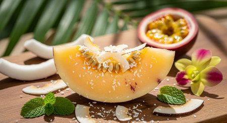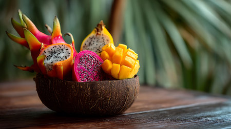 Vibrant tropical fruits on wooden tray: fresh mango, dragon fruit, passion fruit. concept of exotic taste, healthy eating, tropical delight, Vertical.