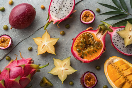 A captivating arrangement of tropical fruits features dragon fruit, star fruit, passionfruit, and more. Their vivid colors and intricate designs highlight natures creativity and abundance.