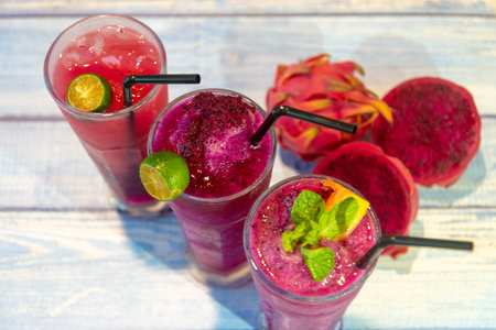 Dragon fruit smoothies with pitahaya, lime and mint.