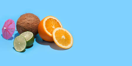 Fresh juicy orange, coconut and green lime with a cocktail umbrella isolated on blue background. Concept of Healthy eating and dieting. Travel and holiday concept. Copy space. Free space for your text